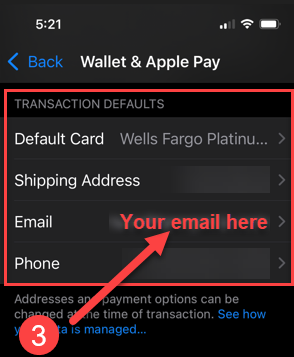 In Wallet & Apple Pay, scroll down to the Transaction Defaults area and open the Email section.